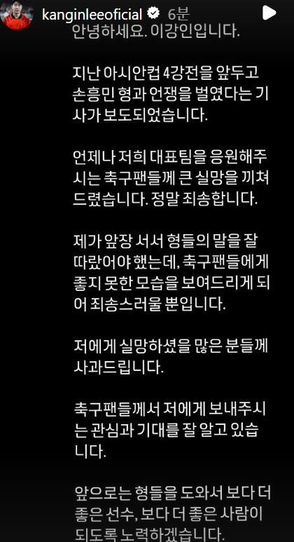 이강인은 14일 SNS를 통해 "아시안컵 4강전을 앞두고 손흥민 형과 언쟁을 벌였다는 기사가 보도됐다"며 "언제나 저희 대표팀을 응원해 주시는 축구 팬들께 큰 실망을 끼쳐드렸다. 정말 죄송하다"라고 밝혔습니다. 이어 "제가 앞장서서 형들의 말을 잘 따랐어야 했는데, 축구 팬들에게 좋지 못한 모습을 보여 드리게 돼 죄송스러울 뿐"이라며 "저에게 실망하셨을 많은 분께 사과드린다"라고 썼습니다.