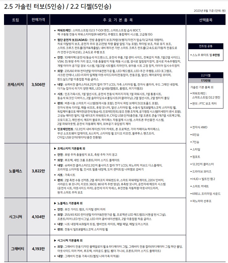 또한, 4세대와 동일한 엔진(G2.5 T-GDI)과 미션(스마트스트림 습식 8DCT) 조합으로 구성되어 있습니다.