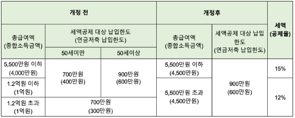연금저축과 퇴직연금을 함께 납입하는 경우에는 900만원(기존 700만 원)으로 상향되었습니다.
